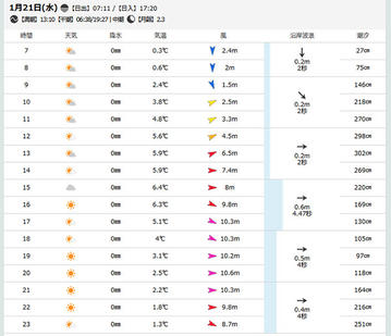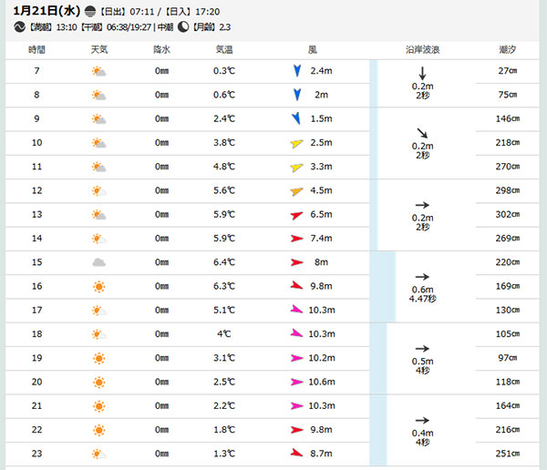 無料の「Windy」「GPV気象予報」も使っていますがピンポイントの1時間毎の予報を数値で一覧したいので「釣り天気jp」というのを使ってみてます。